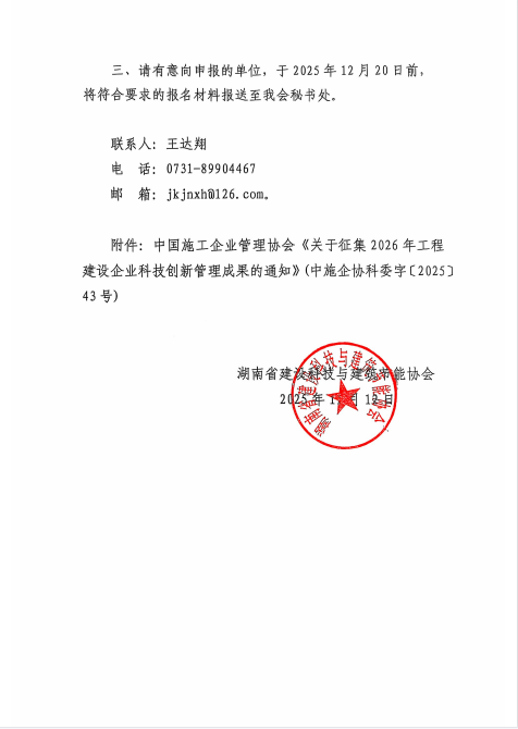 各会员单位: 为深入落实习近平总书记关于科技创新引领产业创新发展的重要论述,总结推广企业科技创新管理体系建设的典型做法和成功经验,引导企业深入开展管理创新,推动企业高质量发展。中国施工企业管理协会印发了《关于征集2026年工程建设企业科技创新管理成果的通知》(中施企协科委字〔2025〕43号)。现将通知转发给你们,并将征集要求通知如下: 一、请各单位积极组织,按“征集内容及要求”做好申报工作,我会将及时组织申报材料的审核以及推荐报送工作。 二、“科技创新管理成果”的内容包括:创新战略规划、创新组织管理模式、创新制度建设、创新经营管理模式、创新人才队伍建设模式与机制、创新平台建设管理模式、科研项目管理模式与办法、科技成果转化管理模式与机制、知识产权保护管理模式与机制、产学研用合作模式,以及科技创新管理其他方面的管理成果。 三、请有意向申报的单位,于2025年12月20日前,将符合要求的报名材料报送至我会秘书处。 联系人:王达翔 电 话:0731-89904467 邮 箱:jkjnxh@126.com。
